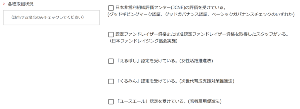 日本郵便株式会社の「2026年度日本郵便年賀寄付金配分団体の公募」では、助成金申請書に、以下の通り、「日本非営利組織評価センター(グッドギビングマーク制度)の評価受診」に関する確認項目が設定されています。