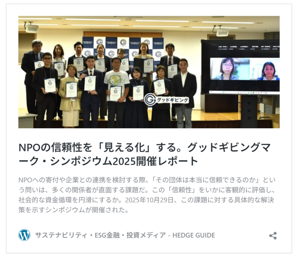 【メディア掲載】金融投資メディア『HEDGE GUIDE』2025年10月30日付において、「グッドギビングマーク・シンポジウム2025開催レポート」の記事を掲載いただきました