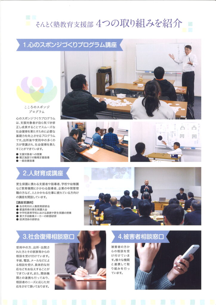 日本財団や法務省等と協働しながら出所者・出院者を対象に住居・仕事・教育を提供し、再犯防止活動に取り組んでいる。特に教育では「人づくり」「仲間づくり」「社会づくり」を目的として独自のプログラムを使った授業、講座、研修、講演活動を行っており、「出所者・出院者」「生きづらさを抱えた方」「人材育成に悩む企業」などに対して「人としての成長」や「人間力の向上」につながる教育を提供し支援活動を行っている。